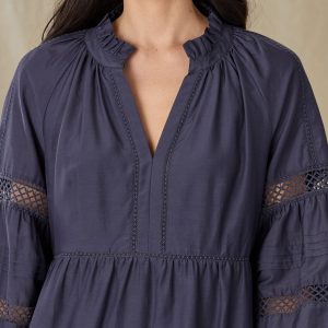 This tiered. raglan sleeve dress is overflowing with delicate. feminine details: lattice trim. pintucking. ruffle collar and notch neckline. Fully lined bodice. Cotton/silk. Machine wash. Imported. Sizes XS (0 to 2). S (4 to 6). M (8 to 10). L (12 to 14). XL (16 to 18). Approx. 36-1/2L.