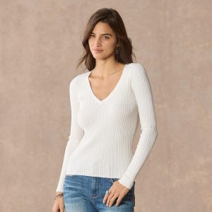 Simple and sophisticated. our fitted. mixed rib stitch sweater. in Lightest Legends yarn. V-neck. Cotton/nylon/spandex. Machine wash. Imported. Exclusive. Sizes XS (0–2). S (4–6). M (8–10). L (12–14). XL (16–18). XXL (20–22). Approx. 24l.
