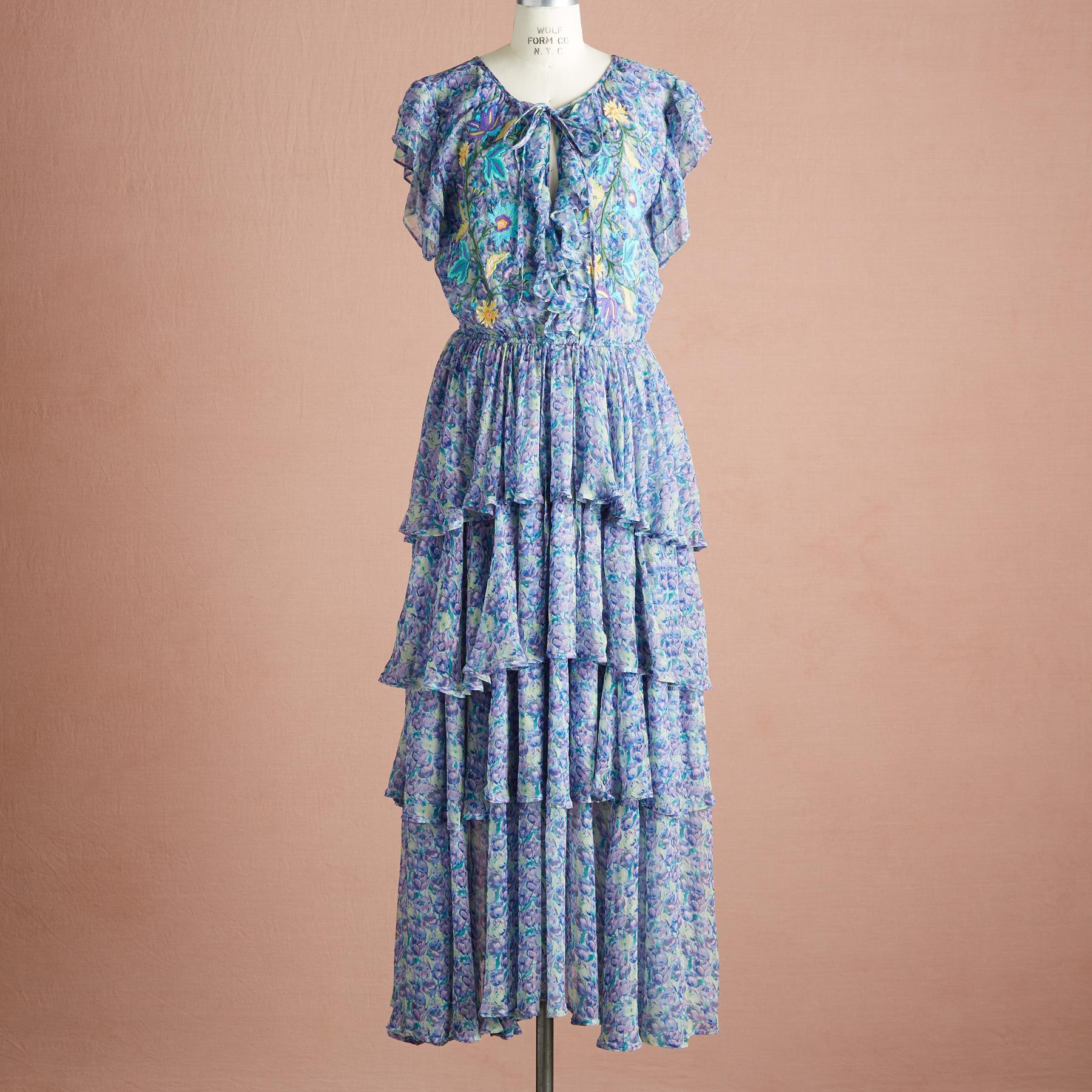Vintage florals are gracefully printed on our easy. tiered dress. embroidered with touches of feminine detail. Cupro. Hand wash. Imported. Exclusive. Sizes XS (0-2). S (4-6). M (8-10). L (12-14). XL (16-18). XXL (20-22). Approx. 57.5l.