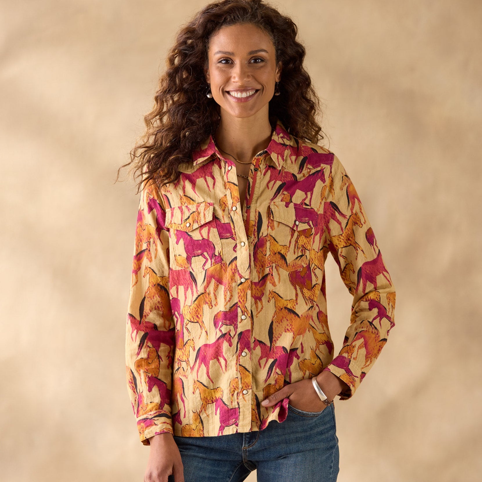 Western-inspired. pearlized snap front shirt in the prettiest cotton dobby with equestrian print. Two chest pockets. lace detail at back neck. grosgrain ribbon at placket. Western back yoke and shirttail hem. Machine wash. Imported. Exclusive. Sizes XXS (00). XS (0–2). S (4–6). M (8–10). L (12–14). XL (16–18). Approx. 25l.